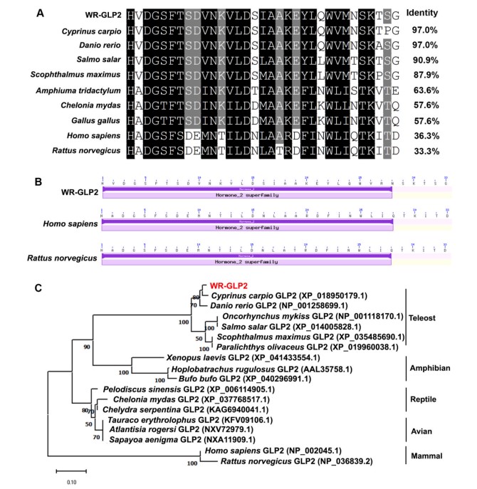 WR-GLP2, a glucagon-like peptide 2 from hybrid crucian carp that protects intestinal mucosal barrier and inhibits bacterial infection |